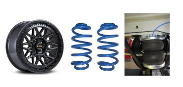 Hier finden Sie Offroad Allterrain Sets für Ihren Sprinter 910 inklusive Wohnmobile - Camper. Das Set besteht aus Fondmetal Bluster Felgen in schwarz sowie MAD Höherlegungsfedern - Zusatzfedern - Zusatzluftfedern