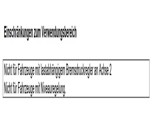 - nicht für Fahrzeuge mit Niveauregelung - nicht für Fahrzeugemitserienmäßigem Luftfahrwerk - nicht für Fahrzeuge mit lastabhängigem Bremsdruckregler an Achse-2 (HA) - nur für Fahrzeuge mit ABS (ABV) - nur für Fahrzeuge mit Blattfedern an Achse-2 (HA)